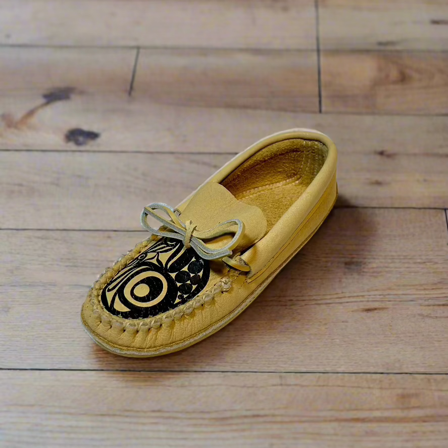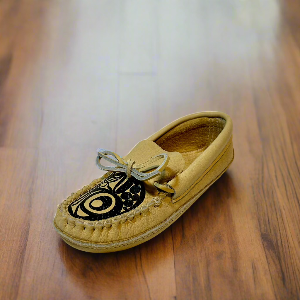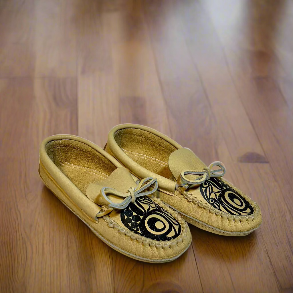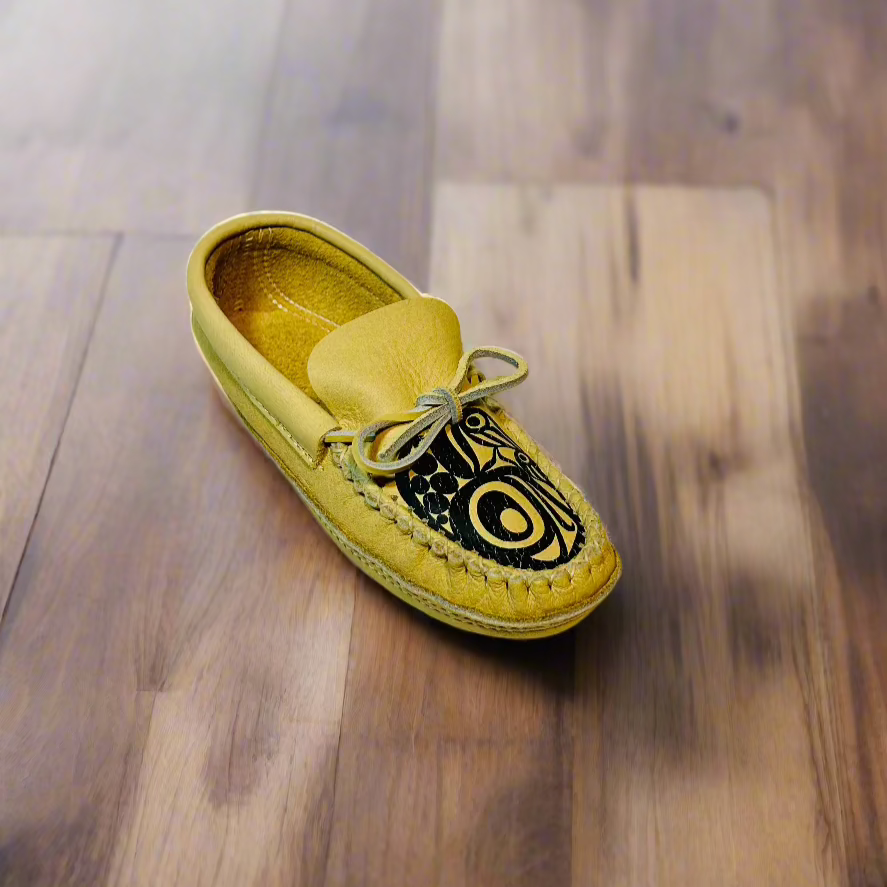 Adorned with the captivating Life Crest Frog design by Bill Helin, these moccasins symbolize family unity, the power of example, and the importance of community over individual gain. The Frog, a revered symbol in Indigenous cultures, represents the voice of the people.