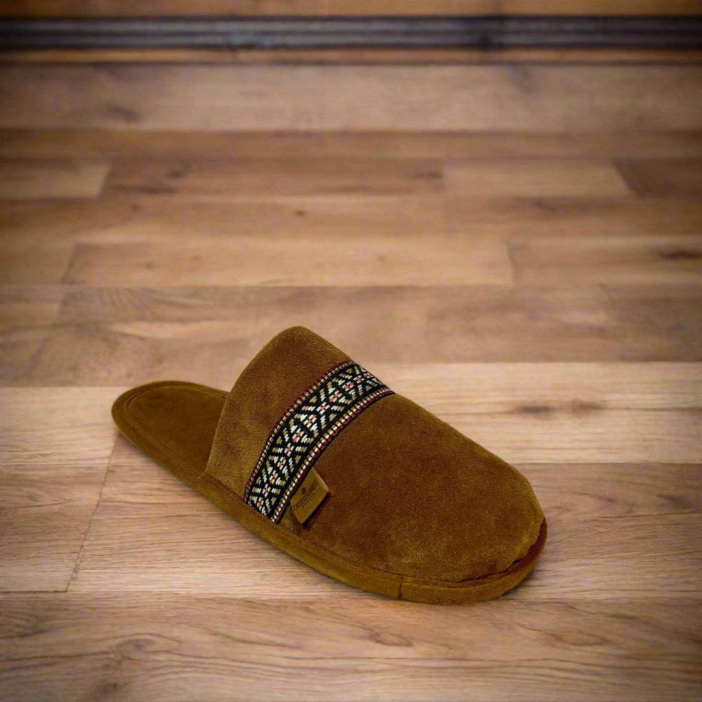 Men's Tecumseh Dark Tan Suede Mule Moccasins With Indian Braid Trim