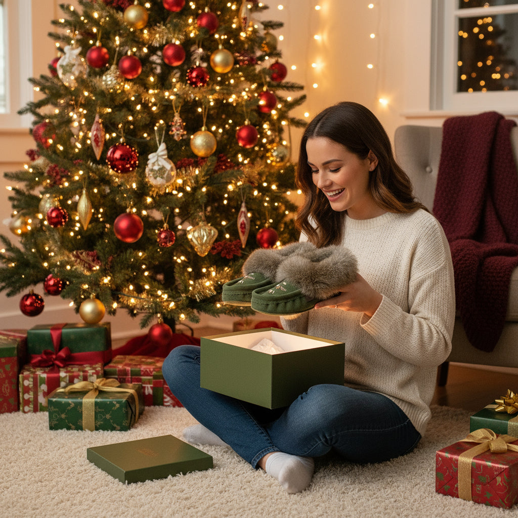 Immerse yourself in the tranquility of the forest with our handcrafted women's forest green suede moccasins from Laurentian Chief. Meticulously crafted in Canada, these slippers offer a harmonious blend of style, comfort, and nature-inspired elegance.
