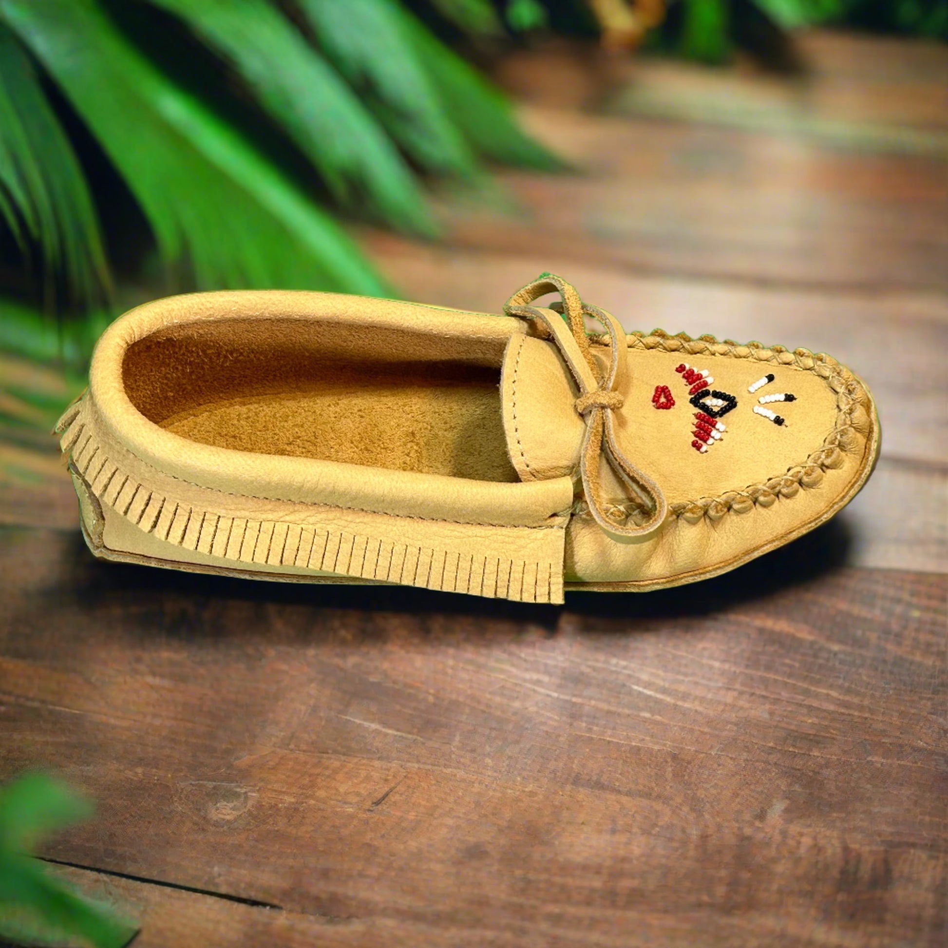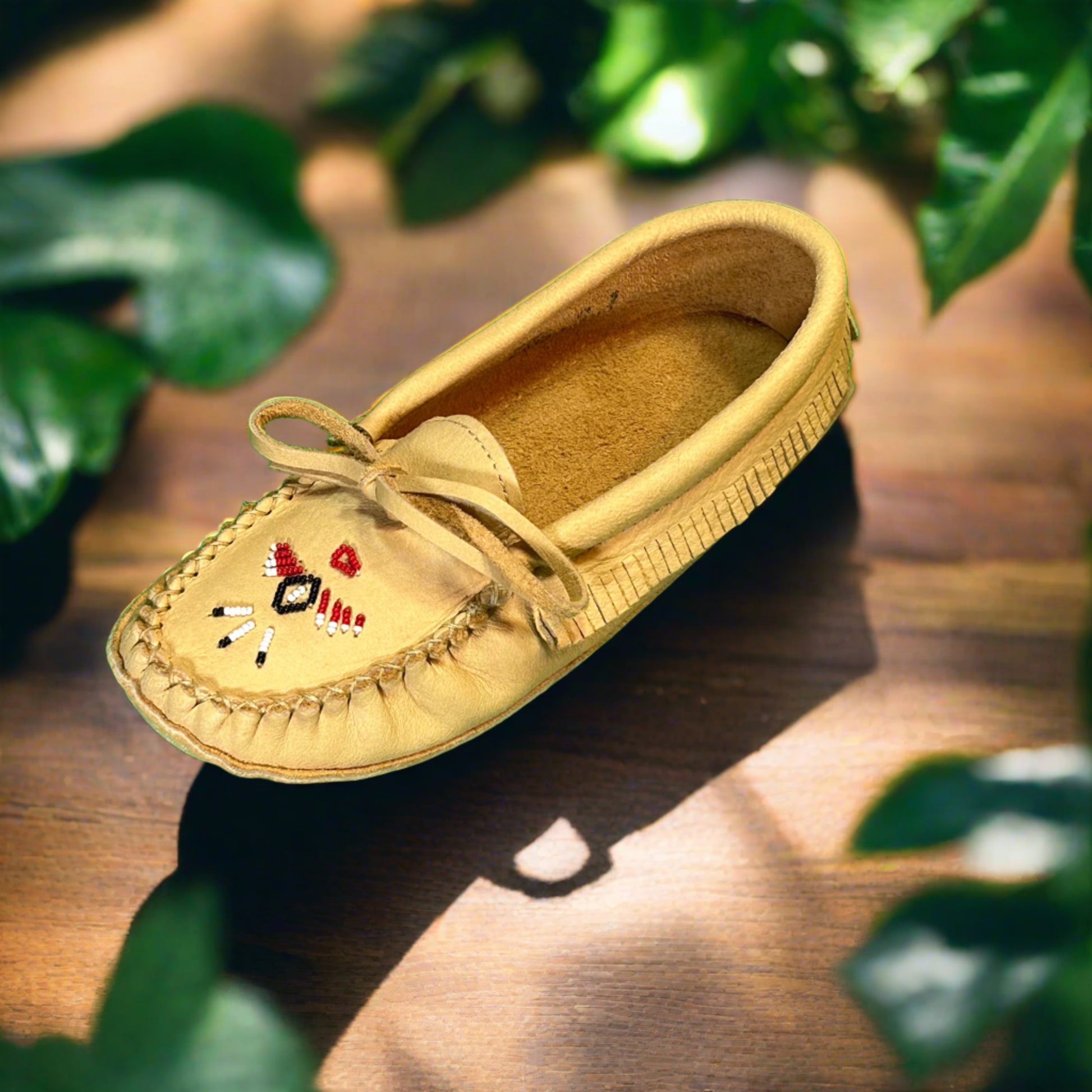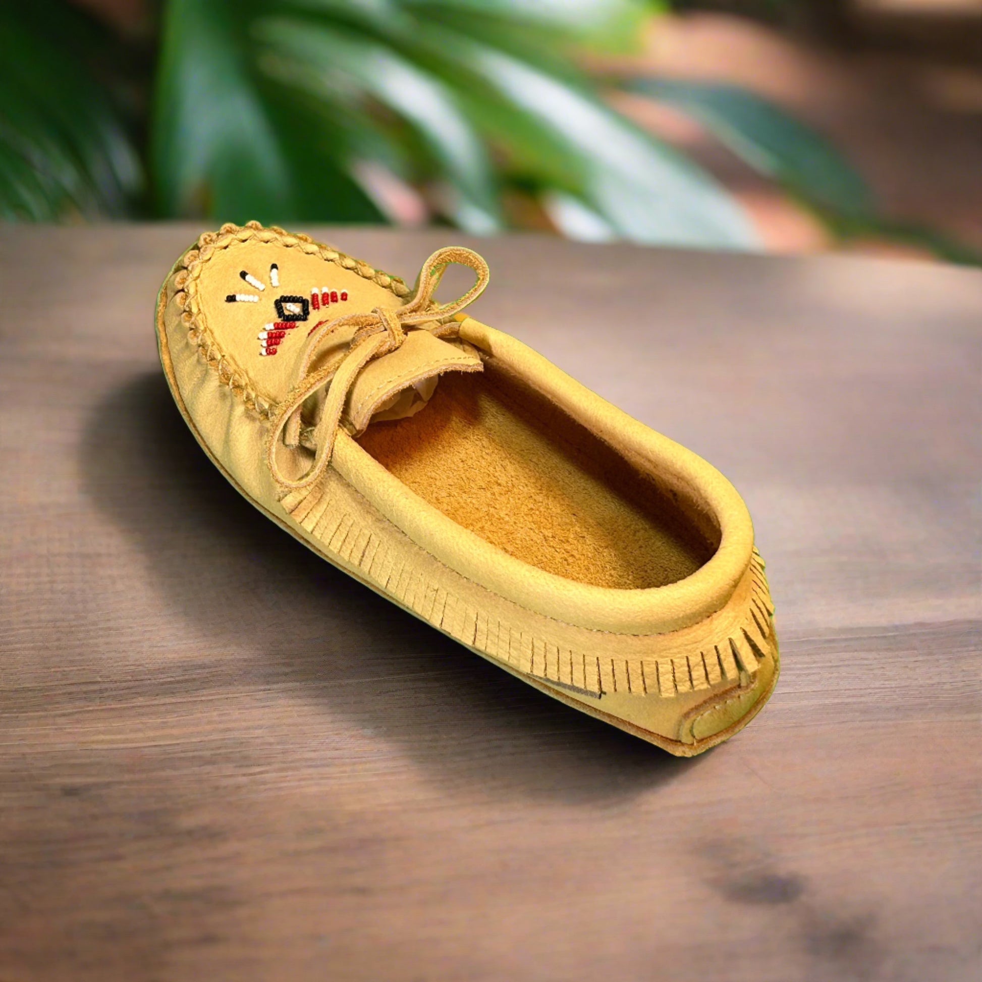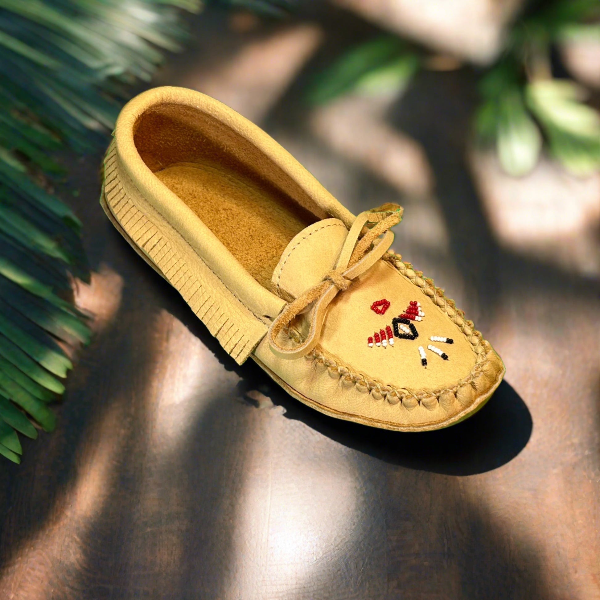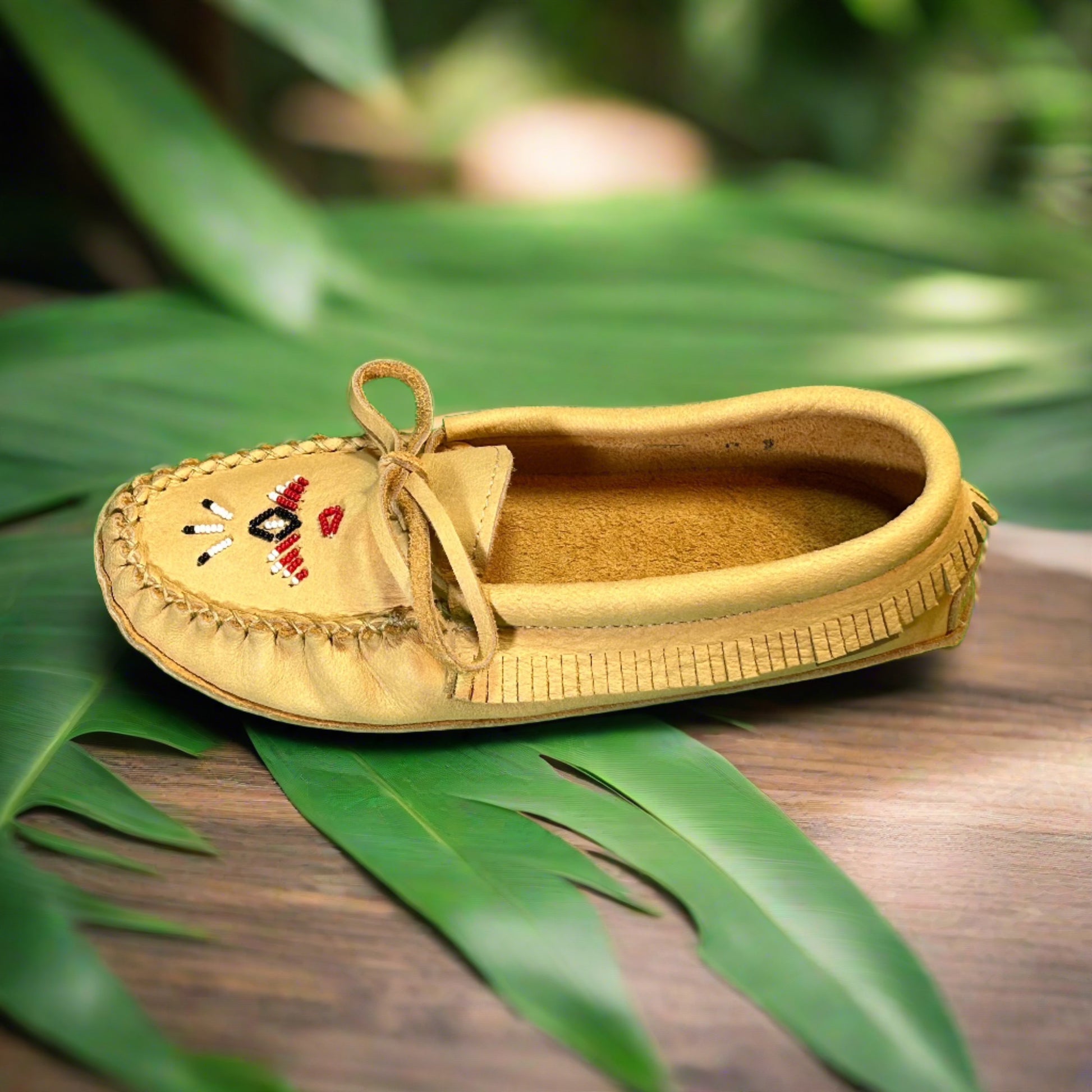 Experience the timeless elegance and unparalleled comfort of our women's natural moosehide moccasins, handcrafted by skilled artisans in Canada. These moccasins are a testament to the rich heritage of Aboriginal craftsmanship, offering a unique blend of tradition and contemporary style. Each pair is a masterpiece, meticulously crafted with attention to detail and a commitment to quality.