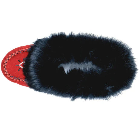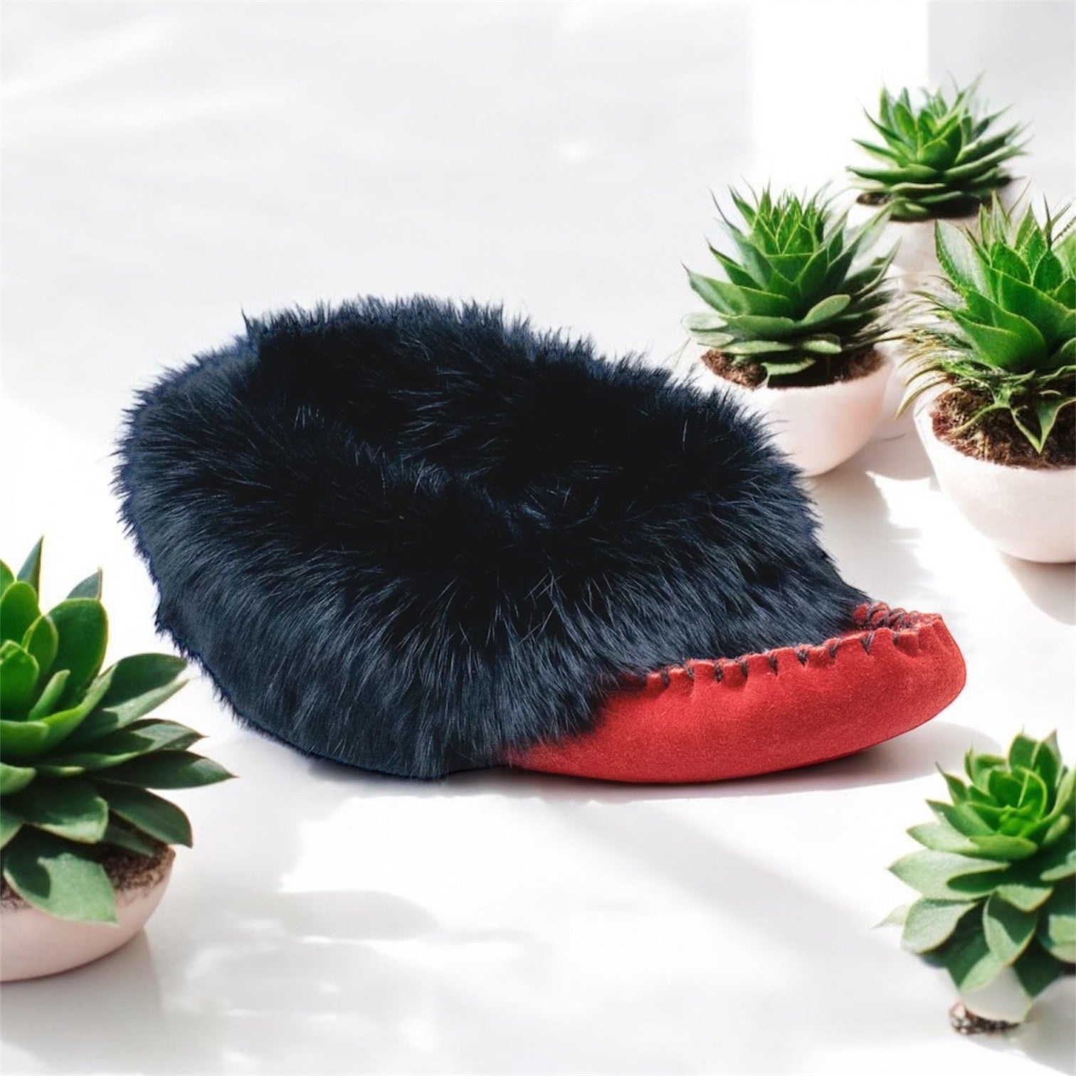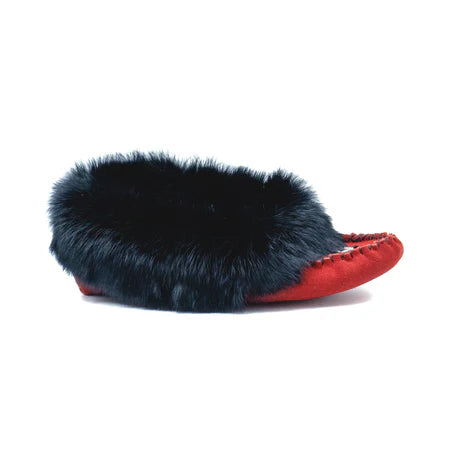 Wrap your feet in the warmth and elegance of our exquisite women's black rabbit fur red suede moccasins, handcrafted by skilled Huron Aboriginal artisans in Canada. These moccasins are more than just footwear; they're a luxurious indulgence, a cozy embrace for your feet, and a piece of art that elevates your style. Each pair is a testament to the rich heritage of Aboriginal craftsmanship, meticulously crafted with attention to detail and a commitment to quality.