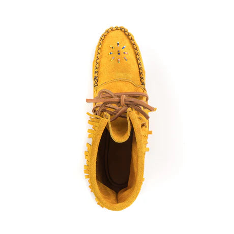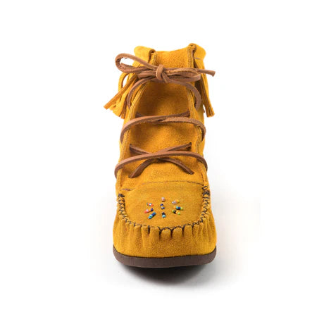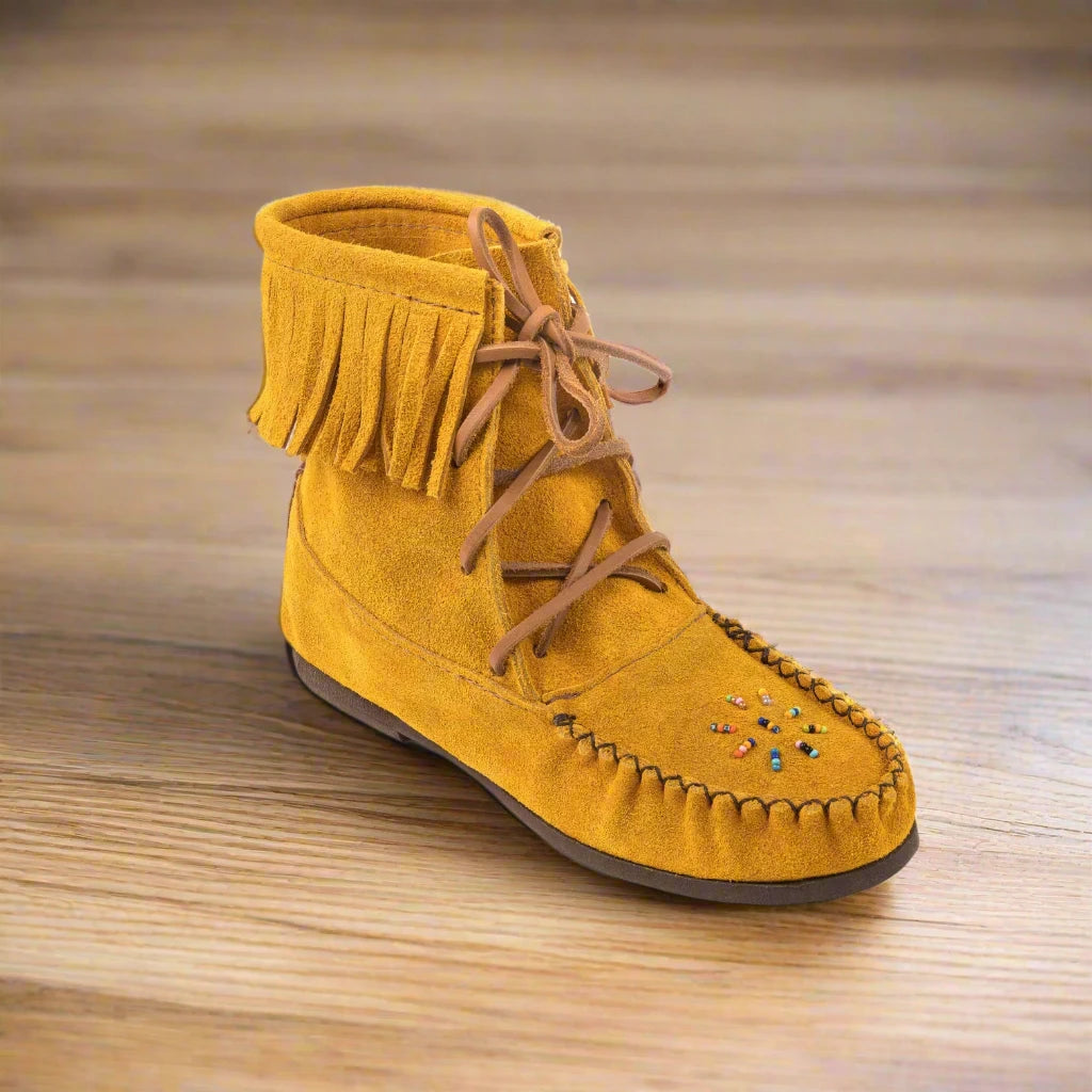 Experience the timeless beauty and unparalleled comfort of our women's Indian tan suede concho moccasin boots, handcrafted by skilled Huron Indian artisans in Canada. These moccasins are a stunning fusion of traditional Native American design and modern style, offering a unique blend of heritage and contemporary fashion. Each pair is a masterpiece, meticulously crafted with attention to detail and a commitment to quality. The soft, supple Indian tan suede is not only beautiful but also incredibly durable, ensuring that these moccasins will be cherished for years to come. The hand-sewn glass beadwork on the vamp adds a touch of elegance and individuality, making each pair truly unique. The stylish fringe on the concho boot collar adds a bohemian flair and enhances the overall aesthetic, while the flexible crepe sole provides exceptional comfort and traction. Whether you're exploring the great outdoors or simply running errands, these moccasins will keep your feet comfortable and stylish all day long.